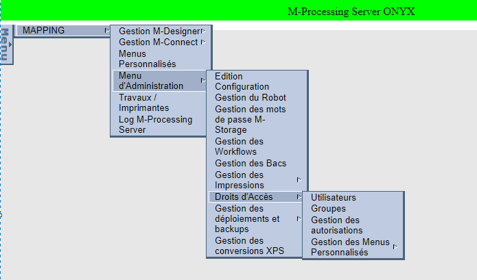 La rubrique Gestion des droits d’accès se trouve dans le Menu Administration. Elle va permettre d’administrer l’accès des utilisateurs à l’interface ONYX Server.
