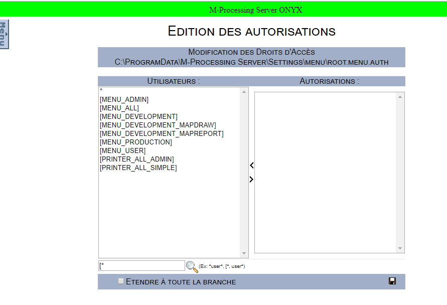 Pour chaque menu, il y a la possibilité de cocher la case “Etendre à toute la branche”. Si cette case est cochée, cela donne aux utilisateurs l’accès au menu en train d’être configurés ainsi qu’à tous ses sous-répertoires.