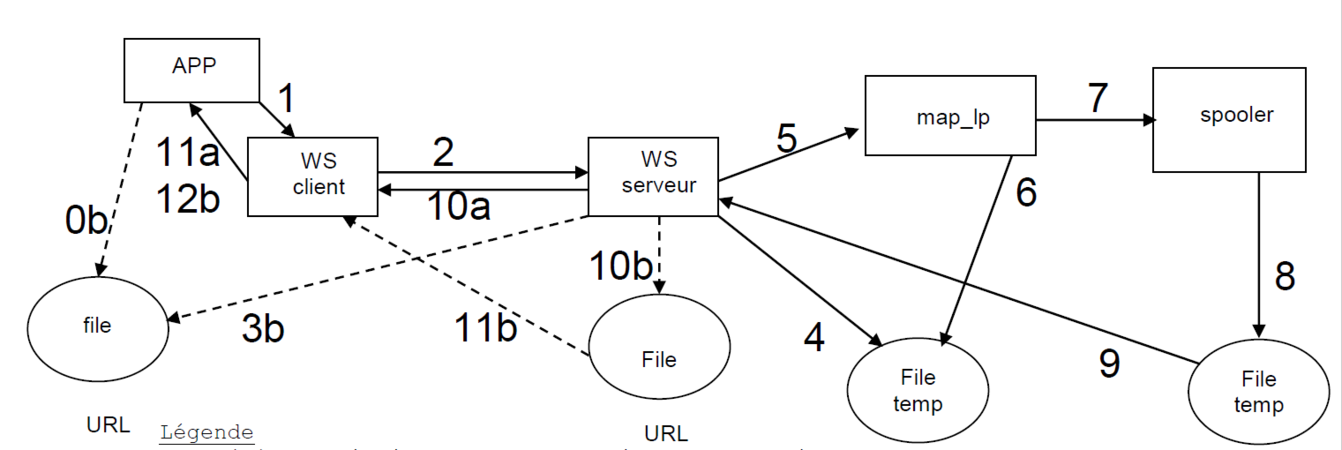La méthode upload permet d’envoyer un spool dans une file d’attente. Un fichier temporaire sera créé côté serveur contenant les données envoyées.Ce fichier sera bien entendu supprimé une fois la commande map_lp exécutée.La version URL nécessite au préalable d’avoir déposé son fichier sur un site accessible au service web.Ci dessous, le schéma présentant l’architecture utilisée lors d’un upload.