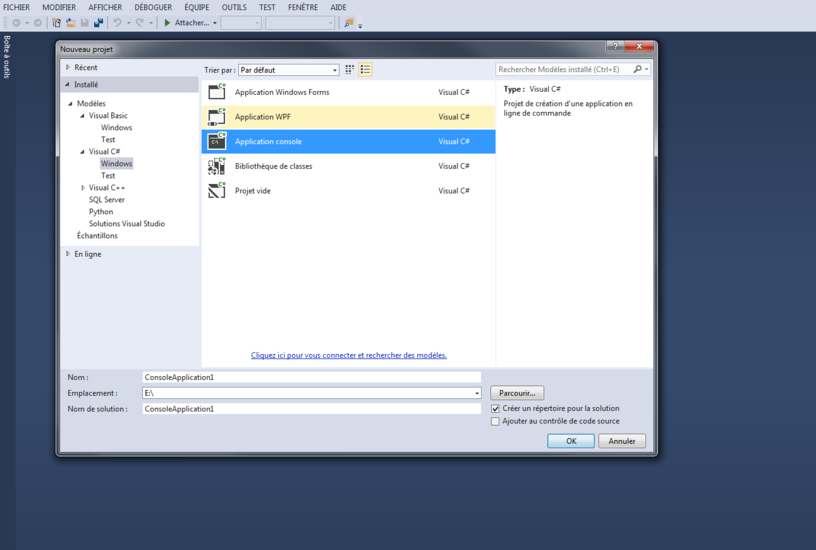 Pour tester le web service mapping sous VS, faire un nouveau projet.Choisir le type de projet, par exemple ici une application console.