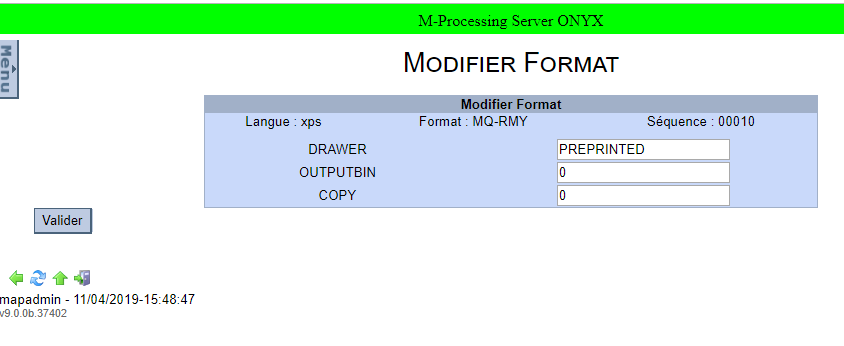 Dans cet exemple, nous n’avons défini que le bac d’entrée. Cela veut dire que, lorsque le format MQ-RMY sera utilisé lors d’un remaquettage, il utilisera le bac d’entrée PREPRINTED.