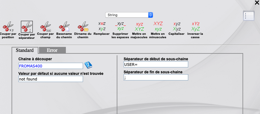 Avec cet exemple, il suffit ensuite de découper la chaine de caractères obtenue directement dans un workflow Mapping, à l’aide de la boite “String/Couper par champ”, en précisant le délimiteur ainsi que le numéro de champ à extraire. Par contre, la position de l’élément est importante dans ce cas.